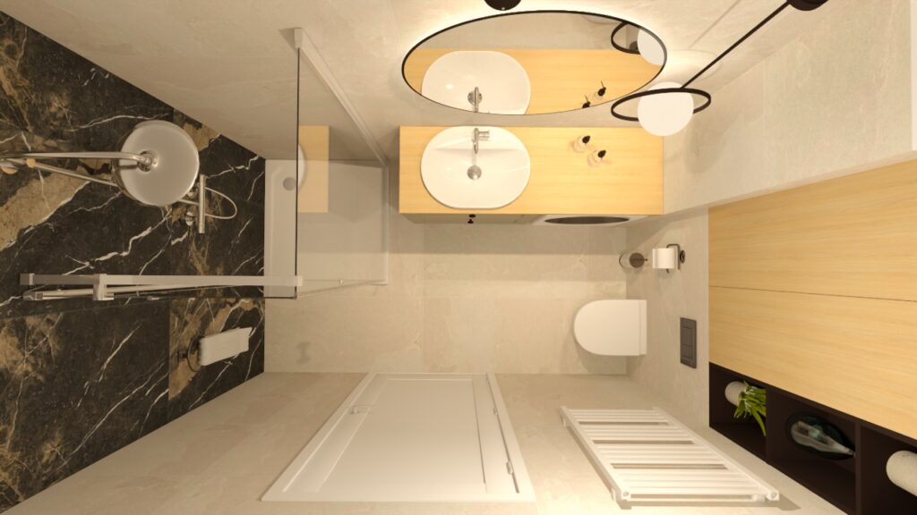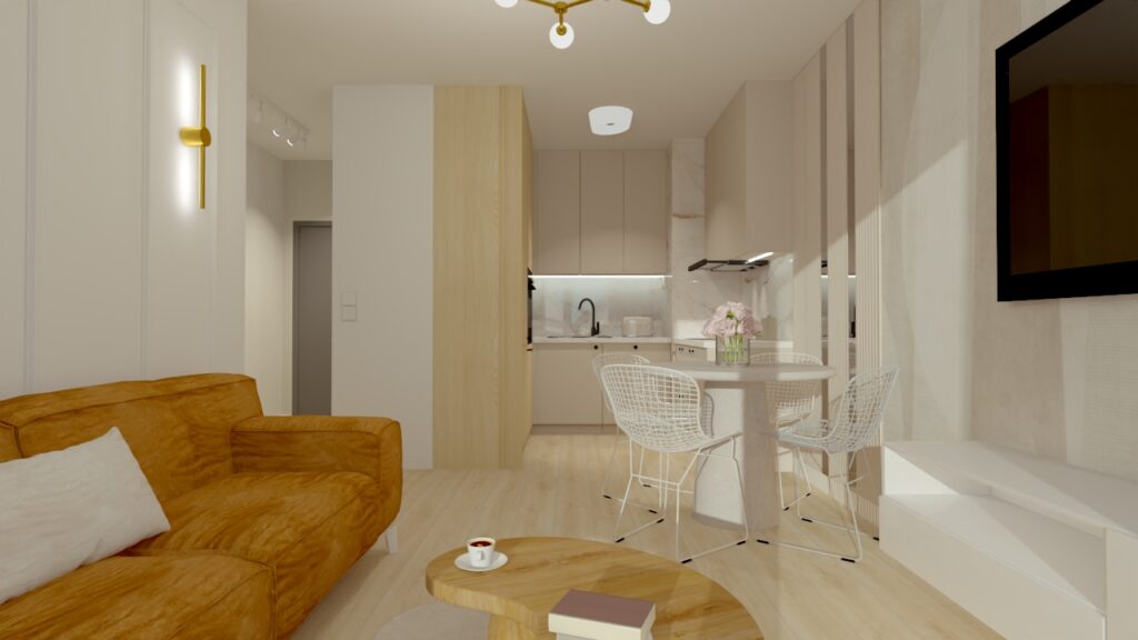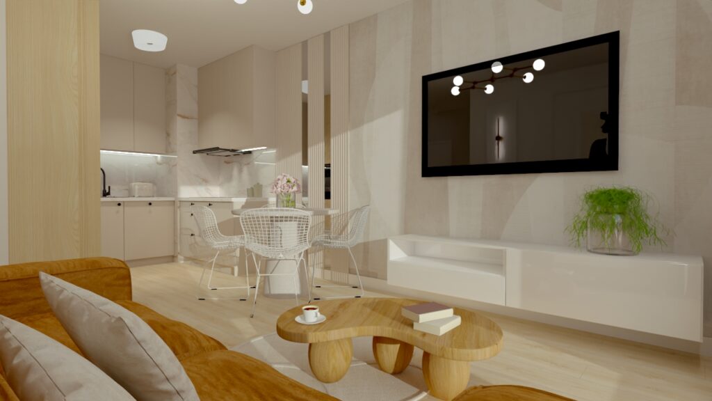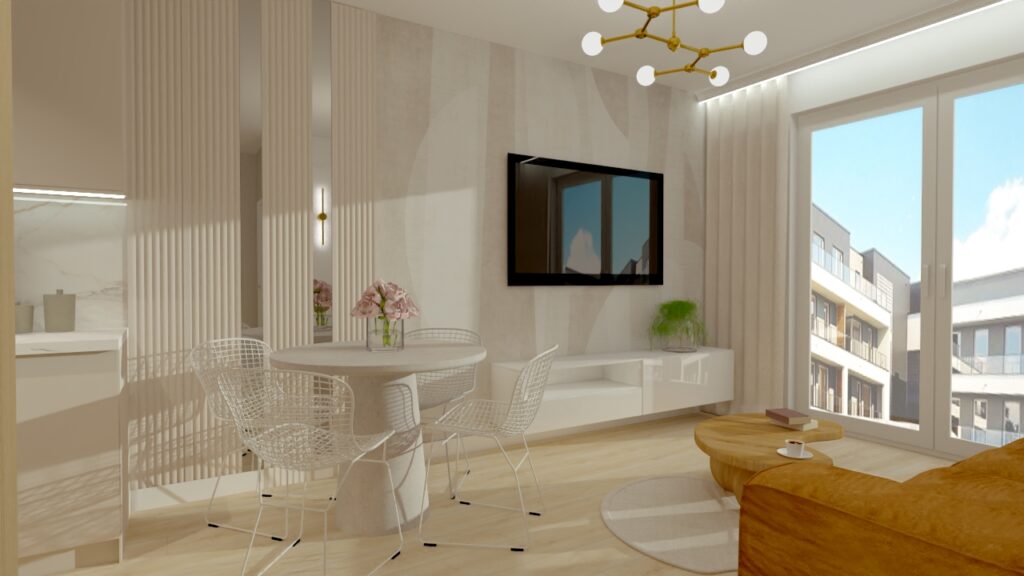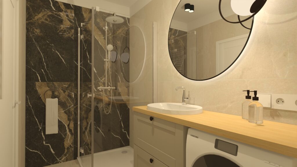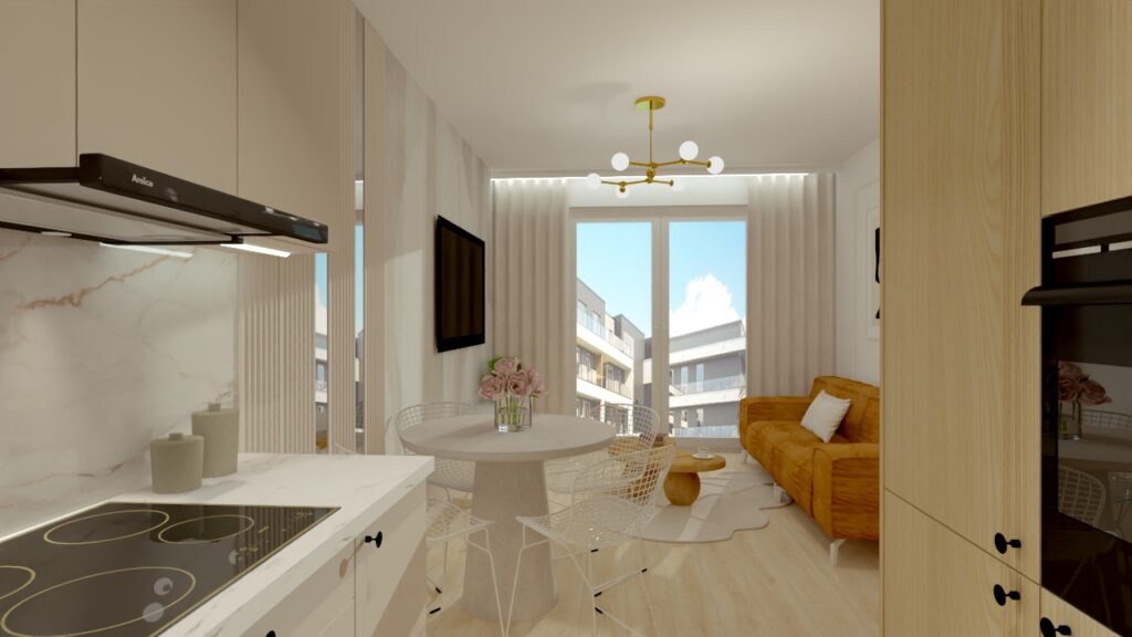 Mieszkanie zostanie wykończone z wysokiej jakości materiałów. Na ścianach gładź, tapeta, sztukateria. Na podłogach wysokiej klasy wodoodporne panele podłogowe. Drzwi bezprzylgowe marki DRE. W przedpokoju funkcjonalna szafa w zabudowie z otwieranymi drzwiami z lustrami. W łazience ściana prysznicowa pokryta wielkoformatową włoską, pozostałe ściany w pięknym beżowym kamiennym gresie. Kabina prysznicowa z otwieranymi drzwiami, brodzik konglomeratowy biały o wymiarach 90×90 cm. Baterie firmy Grohe. Armatura sanitarna wysokiej jakości oraz zabudowy meblowe wykonane z lakieru. Kuchnia zostanie wykonana z wysokiej klasy materiałów, w pełni zabudowana funkcjonalnymi szafkami oraz wysokiej klasy sprzętem AGD. W całym mieszkaniu oświetlenie: lampy sufitowe oraz ledy.